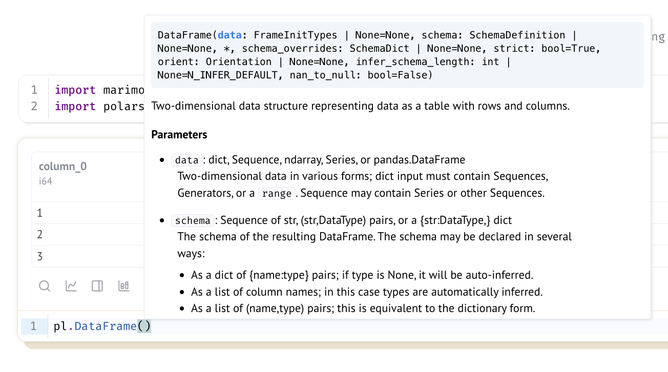 Signature hints show a function’s docstring above your code as you type, making it easy to recall its arguments and usage. Enable this feature under the Editor section in the Settings panel.